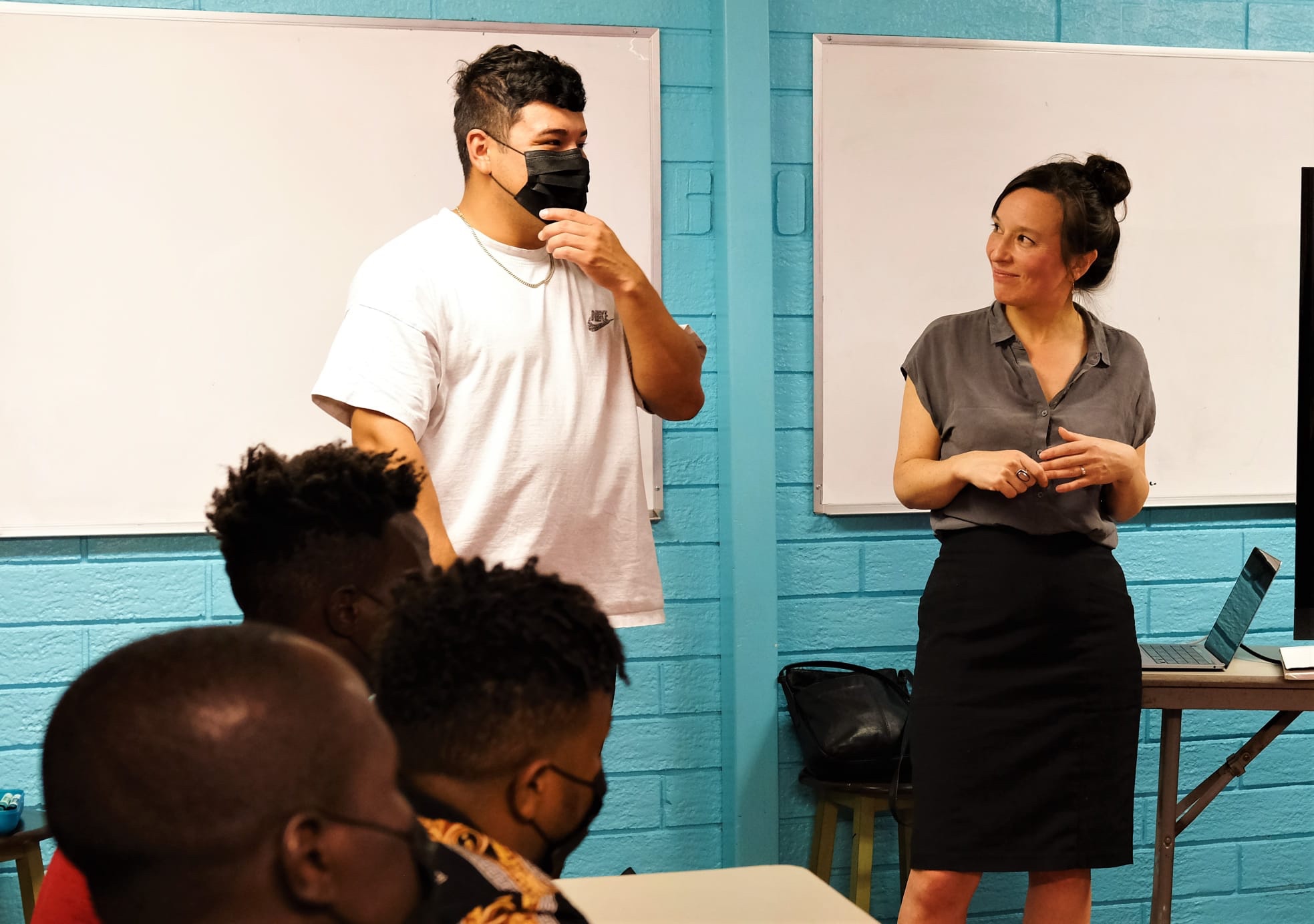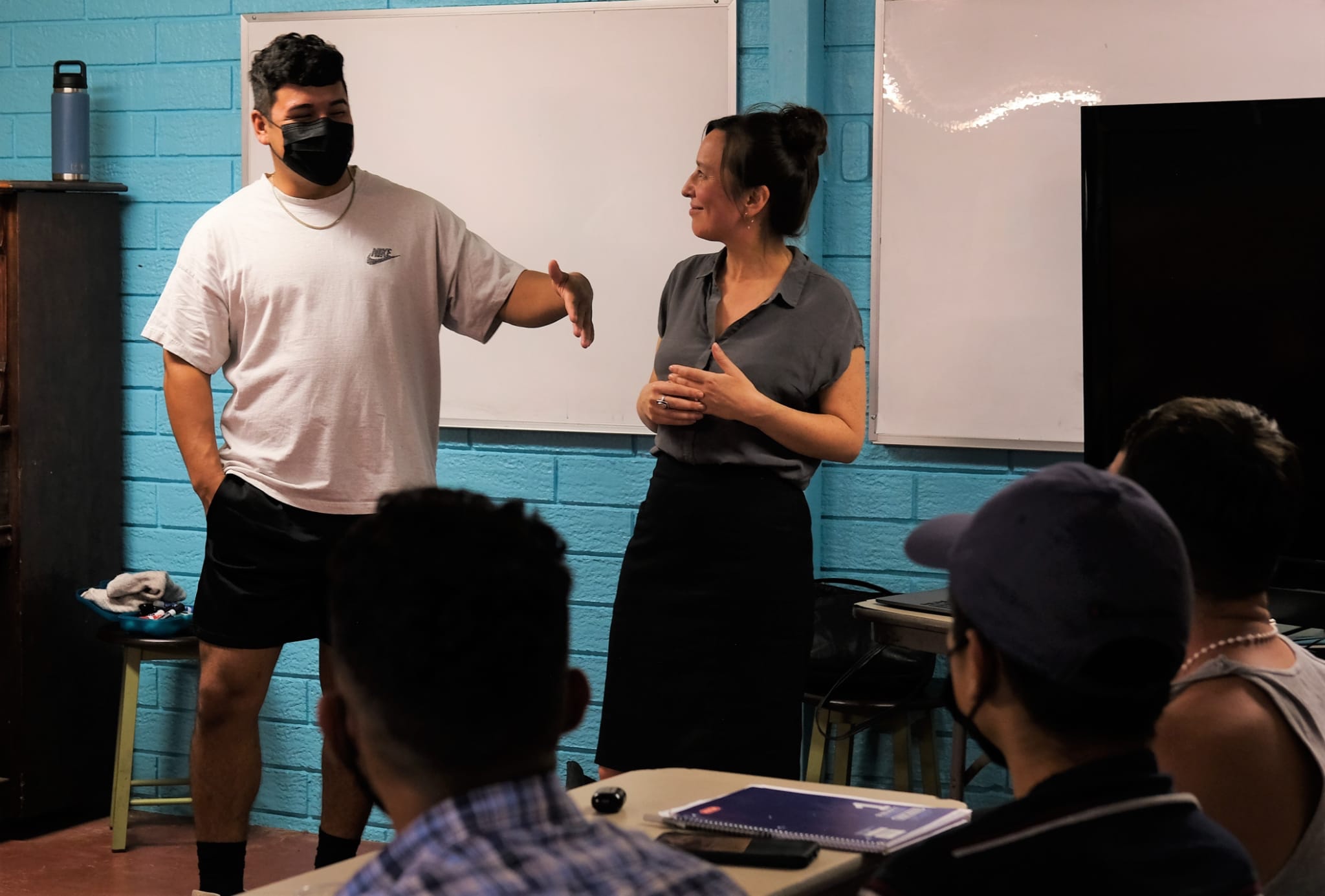 Videographer and photographer Jessie Rodriguez and Carolina during one of many presentations of the Digital Detention Project at Casa Marianella, a shelter for asylum seekers in Austin, Texas, followed by discussions with staff, volunteers and asylum seekers from Colombia, Honduras, Ecuador, Ghana, Nicaragua, Angola, El Salvador, Eritrea, Congo, Pakistan, Afghanistan, Venezuela, …